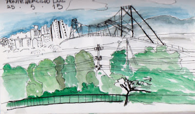 Este dibujo está hecho desde un lugar que, viviendo en la isla, nunca habíamos visto. Se ve el puente hacia San José y algunos barrios del continente. Es antiguo y está en reparación hace años. Es hermoso y desde donde estaba yo había una plaza y un mirador recién construidos. Este sí que es un lugar para visitar en el centro.
